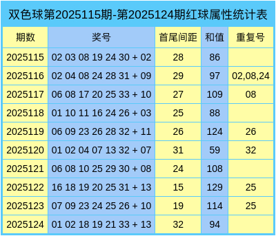 该期红球首尾间距:32,属于高位间距;和值:94,属于:小和值;上期无重号。