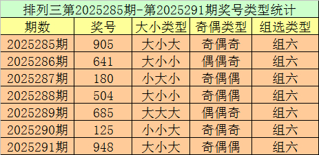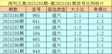 罗列三第2025291期回想:奖号948,奇偶比1:2,大小比2:1,和值21,类型:组六。