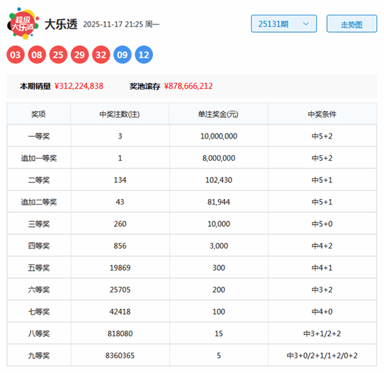 大乐透第2025131期开奖号码为:03、08、25、29、32+09 12。其中前区奖号三区比为2:0:3,奇偶比为3:2,包含1个重号:29,后区为全三区号码。