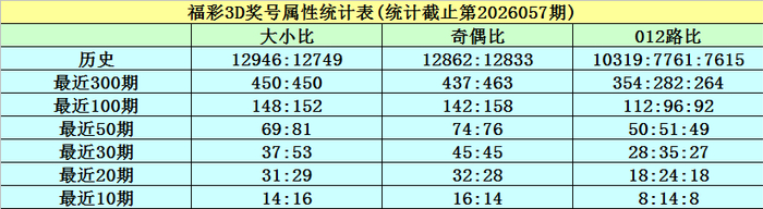 开奖回归:福彩3D第2026057期奖号为264,其中奖号大小比为1:2,奇偶比为0:3,012路比为1:1:1,和值为12,跨度为4。